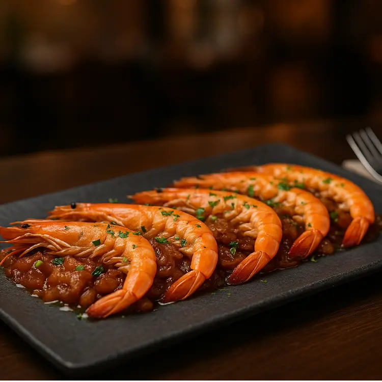 Langostinos salteados con cebolla caramelizada